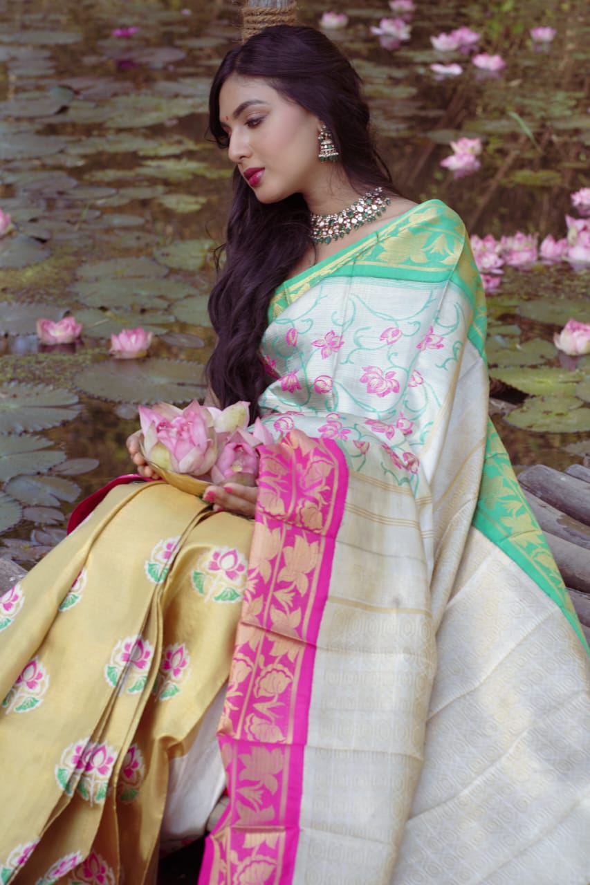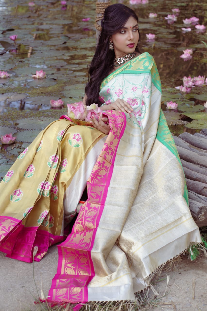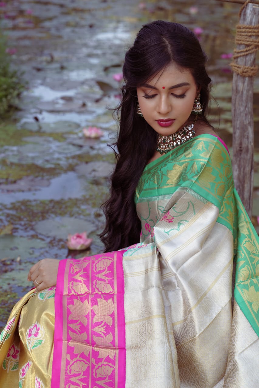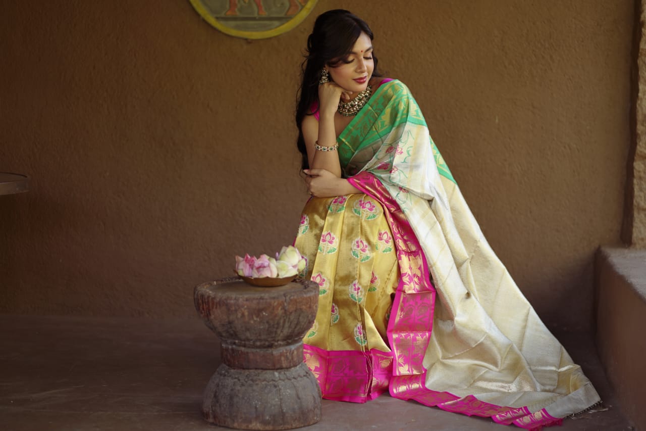 Unleash your inner diva with the epitome of elegance our dual tone zari (partly pallu)tissue saree adorned with exquisite korvai borders,intricate designs and captivating motifs.Indulge in the luxuryof this masterpiece and make a stunning statement wherever u go.Elevate your style and embrace timeless beauty with our limited edition collection. This saree is a fusion of two designs padmalata woven on silver zari and padmini motifs woven on gold tisssue adorn yourself in this unique creation with a blouse woven in silk with brocade design.