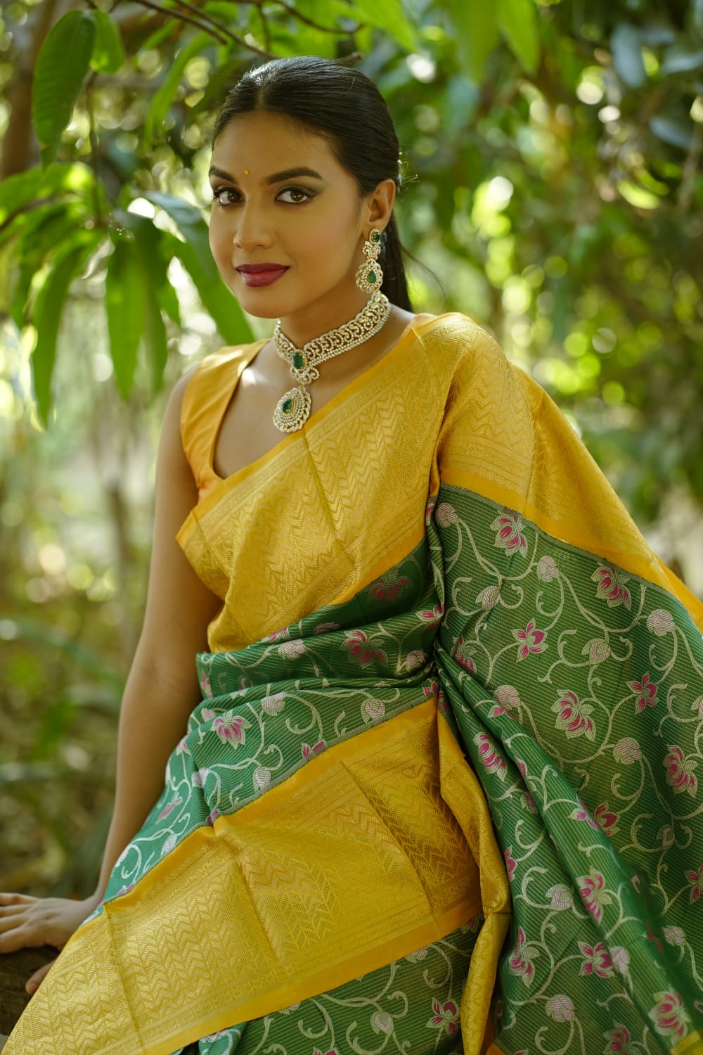 This green tissue kanjivaram saree is an elegant handwoven piece of art our artisans have put their heart and soul into every thread to create such a masterpiece Padmalata from our Sacred Lotus collection. The warp of the saree is woven in silk whereas the weft of the body is mixed with gold zari woven into a green tissue the zari is woven in such a way that it just gives a touch of shine to the fabric a old method used more than 50 years past our time by the master weavers we have sucessfully revived this technique and created a masterpiece the design on the body is woven using silver zari and meenakari the flower lotus in designed in a unique creper design the korvai border if the saree is woven in gold tissue and design on the border is woven using gold zari,the pallu of the saree is woven in gold tissue the blouse of the saree is woven in gold tissue with a brocade design woven on the blouse.