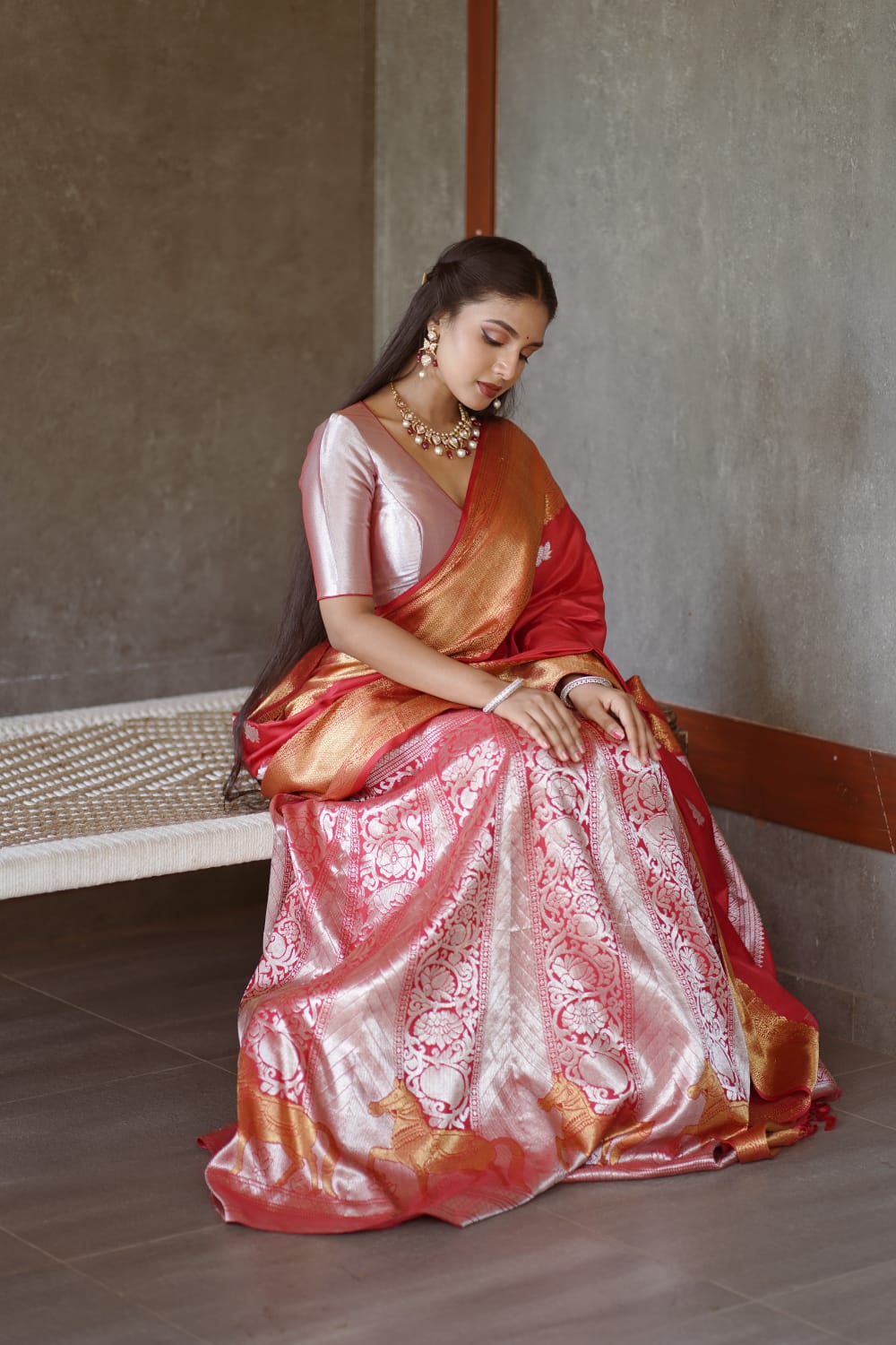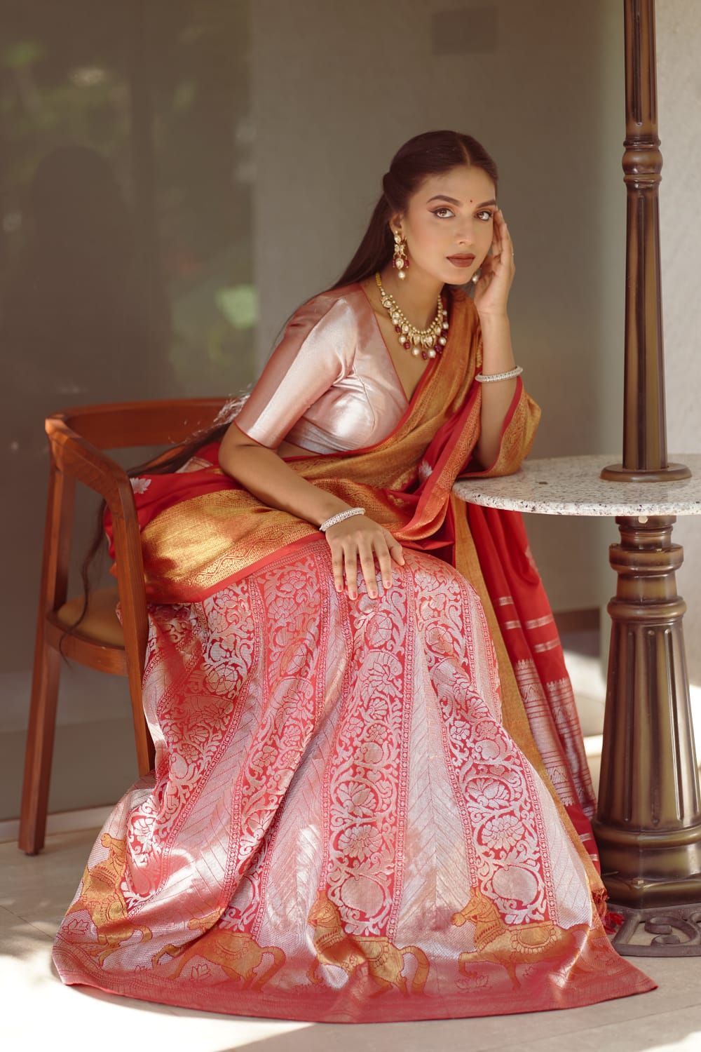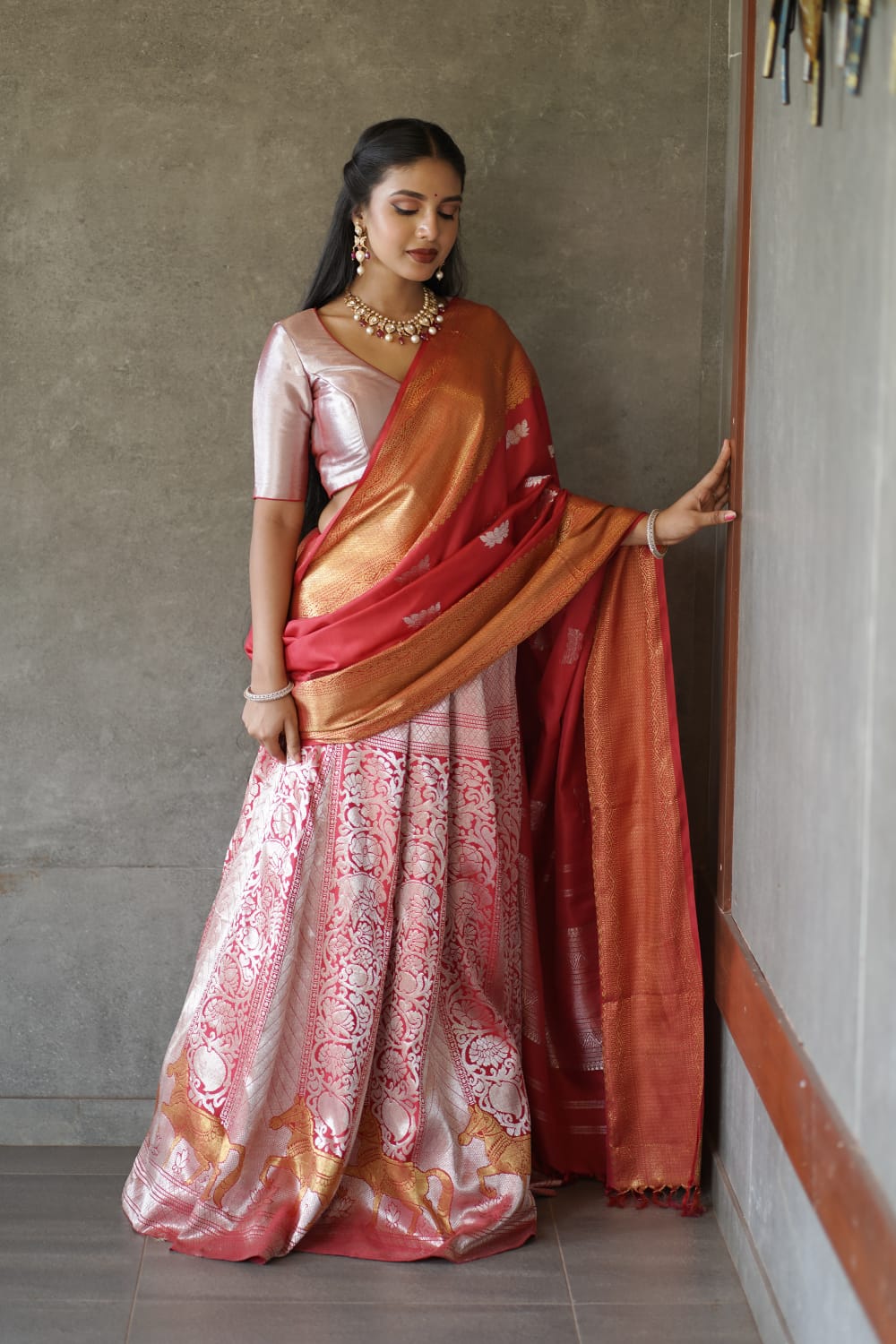 The Pink Gold Tissue Sareee has designed woven in /meenakari on the body. The lotus motif are woven in trellise design. The master piece has korai border woven in gold tissue with design woven in gold zari. Pallu and blouse of the saree woven in gold tissue is a master piece woven by our skilled artisans with utmost casre and precision. Padmavalli from sacred lotus collection.
