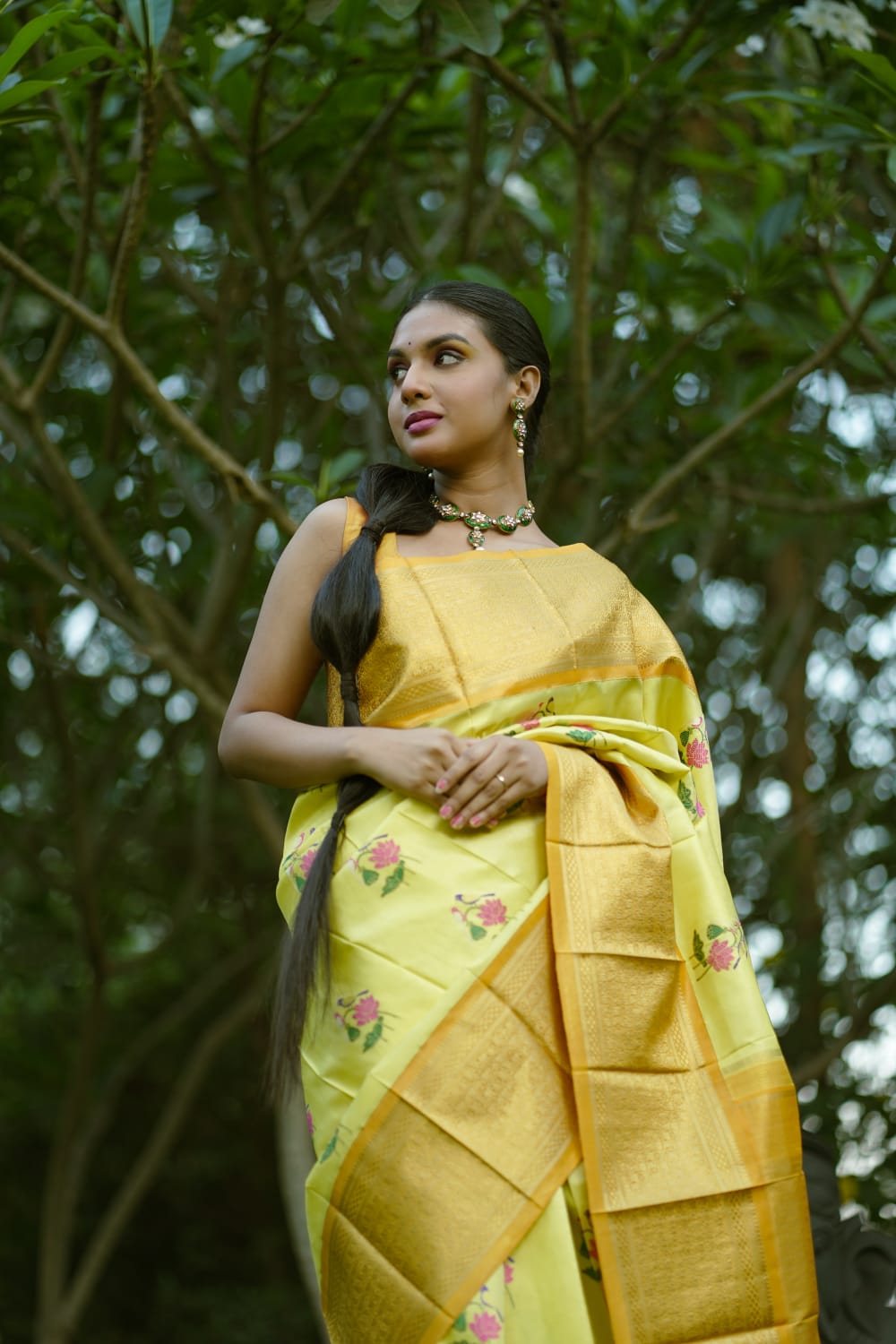 This lemon yellow silver tissue saree with a gold korvai border is a master piece from our Sacred Lotus limited edition collection Padmaraga is a master piece with robbin birds singing on lotus pods and lotus flowers are woven in silver zari and silk thread woven using meenakari technic the border is woven in gold tissue with design is woven using gold zari on gold tissue border this saree is woven with utmost care and precision this unique combination is a must have for handloom admirers to treasure for a lifetime to passon to generations blouse is woven in gold tissue with motifs woven in meenakari.