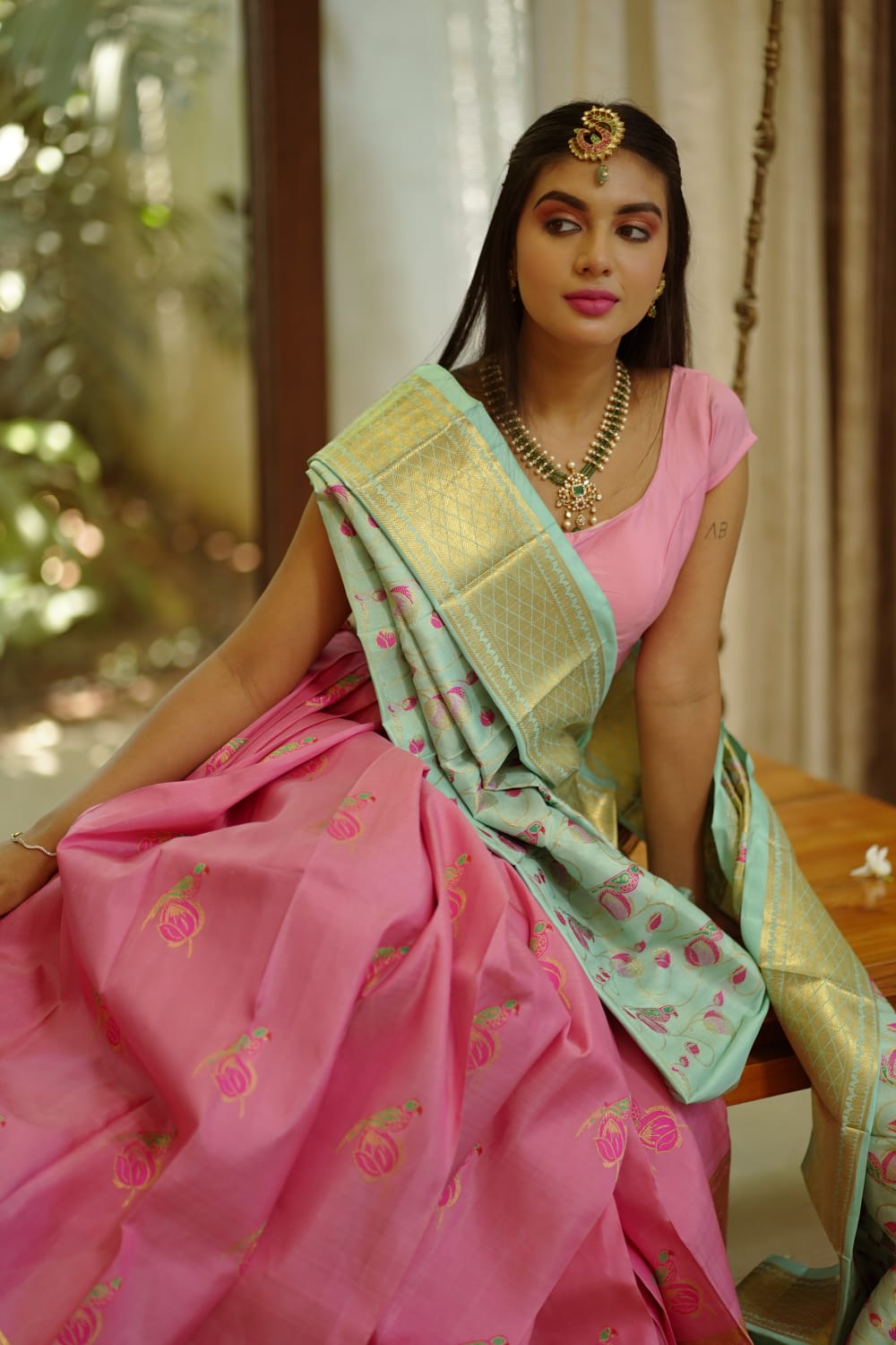 Experience the allure and grace of our Lehangas range,designed to make you feel like royalty at any ocassion.Embrace the tradition and beauty of indian culture with these breathtaking pieces that will leave everyone in awe.Celebrate your feminity with Padmlata and Padmadala our exquisite pastel blue dupatta features a parrot perched on delicate lotus bud is placed in between creepers of lotus buds, intricately woven with meenakari craftmanship. Padmadala the Pink Lehanga features a Divine Parrot perched on a lotus bud woven in meenakari accompanied by a pastel pink brocade blouse.This ensemble captures the essence of indian celebration for women of all ages.