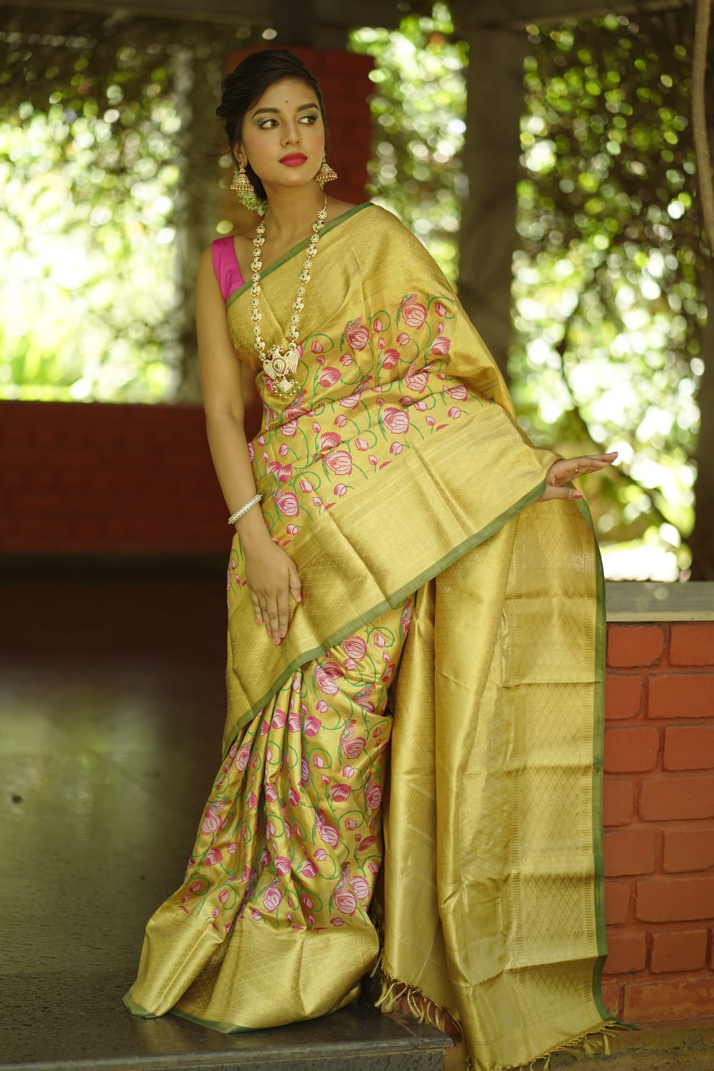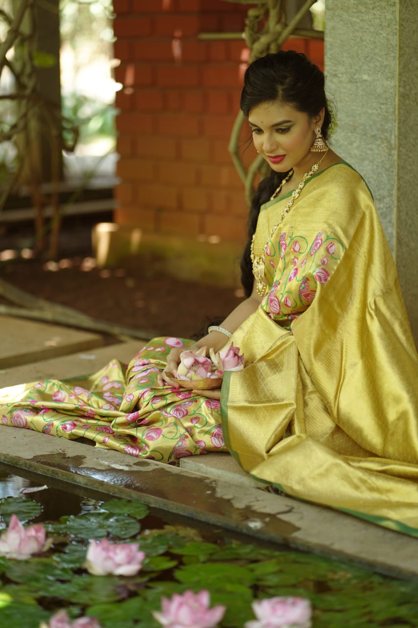 Introducing Padmalata from our exquisite Sacred Lotus collection!This limited edition masterpiece is a true marvel,meticulously crafted with the finest gold zari.The delicate weaving technique showcases the intricate geometrical borders,perfectly balanced to create a stunning visual appeal.The body of the saree is adorned with the enchanted art of meenakari,delicately woven using luxurious silk threads.This extraordinary creation is a testament to timelss elegance and impeccable craftmanship. Embrace the allure of Padmalata and indulge in sheer opulence.