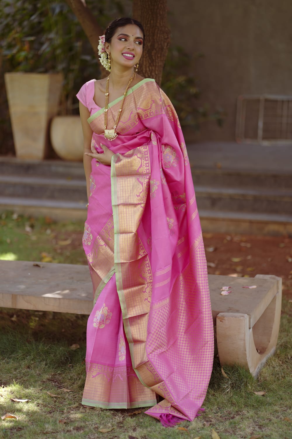 This pastel pink silk sareee with green edge is a unique piece with motifs woven in meenakari. The parrots perched on lotus is woven in meenakari with a lattice border balancing thhe body design. Padmasani from sacred lotus collection.
